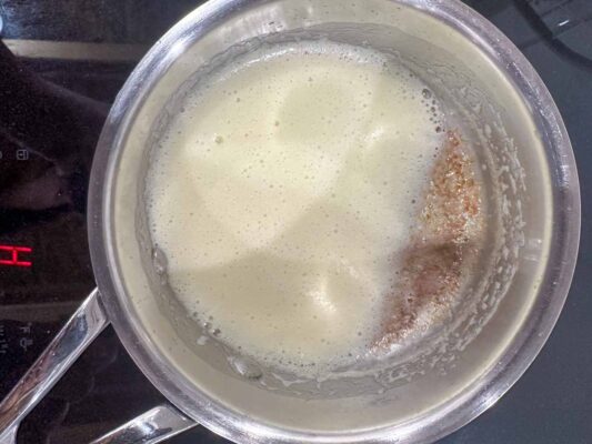 After a few minutes, the milk solids will begin to brown at the bottom of the pan and the butter will smell nutty and caramelized. Once it turns golden brown, immediately remove it from the heat and pour it into a heatproof bowl to stop the cooking.