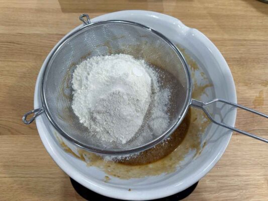 - Add Dry Ingredients. Sift in the flour, salt, and baking powder. Switch to a spatula and stir just until the dry ingredients are fully incorporated—don’t overmix.270g (2 cups + 2½ tablespoons) all-purpose flour/ plain flour, ¼ tsp fine sea salt/ table salt, ¼ tsp baking powder