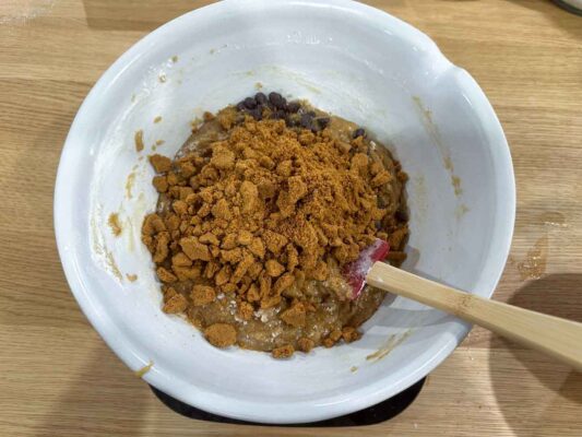 STEP 6. Fold in the Mix-Ins. Fold in the chocolate chips and crushed Biscoff cookies until evenly distributed throughout the batter.