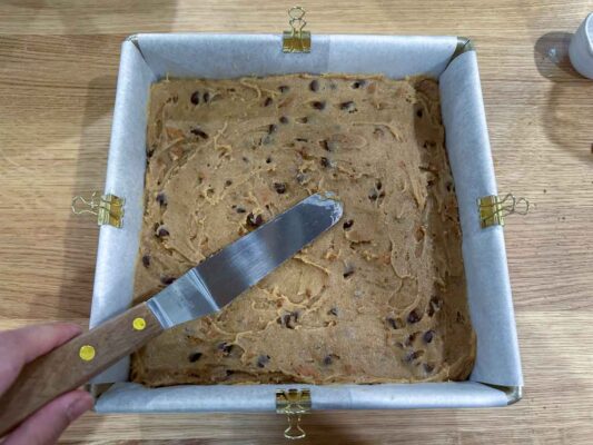 - Assemble the Blondies. Spread the batter evenly into the prepared pan.