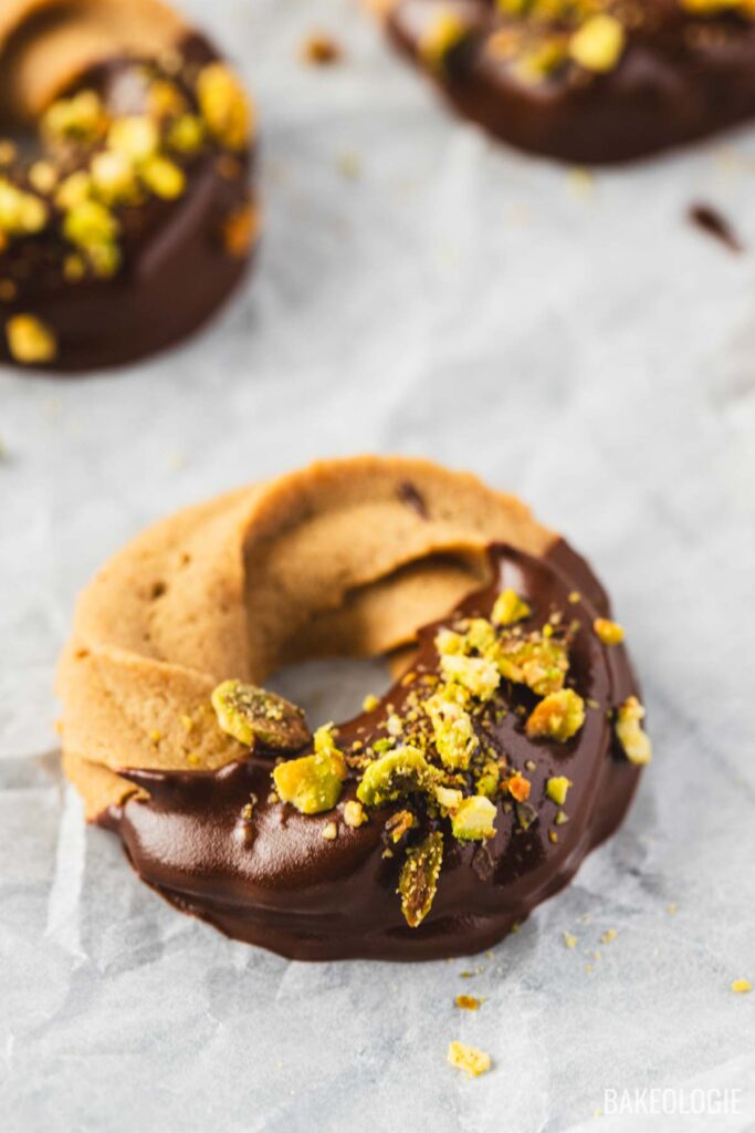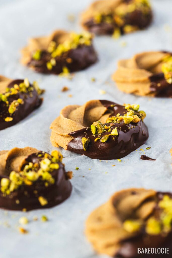 Dip in chocolate: Once cooled, dip each cookie halfway into melted chocolate and place on parchment. While the chocolate is still wet, sprinkle with chopped pistachios. Let the chocolate firm up at room temperature, or chill for a few minutes to speed it up.