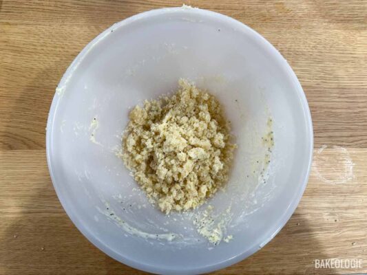 - Make the streusel. In a medium bowl, whisk together the flour, salt, sugar, and lemon zest. Add the melted butter to the dry ingredients and use a fork to work the butter into the dry ingredients until there are no bits of white flour left, and the streusel forms clumps.125g (1 cup) all-purpose flour/ plain flour, ½ tsp fine sea salt, 75g (6 tbsps) granulated white sugar, 1 tsp lemon zest, 85g (6 tbsps) unsalted butter, melted