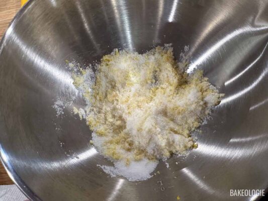 - Mix dry ingredients. Place the sugar in another medium bowl, then zest the lemons into the same bowl on top of the sugar until you have about 2 tablespoons. Use your fingers to rub the lemon zest into the sugar, until they’re combined well and has a sandy texture.PRO TIP: Rubbing lemon zest and sugar together with fingers helps release the flavorful oils from the zest, intensifying the citrus flavor and fragrance, and infusing the sugar with a bright, zesty taste.150g (¾ cup) granulated white sugar, 2 tbsps lemon zest