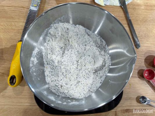 - Into the same bowl, add the remaining dry ingredients: flour, baking powder, baking soda, salt, and the poppy seeds. Whisk until well-combined.219g (1¾cup) all purpose flour/ plain flour, 2 tsps baking powder, ¼ tsp baking soda, 20g (2 tbsps) poppy seeds, ½ tsp fine sea salt