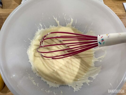 STEP 5. Mix wet ingredients. In a large mixing bowl, whisk together the liquid ingredients: melted butter, egg, sour cream, lemon juice, and vanilla.