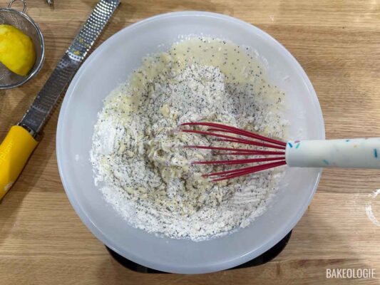 STEP 4. To the same bowl, add the remaining dry ingredients: flour, baking powder, baking soda, salt, and the poppy seeds. Whisk until well-combined.