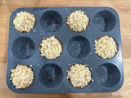 - Divide the batter evenly between the 12 muffin cups (about 70 grams per muffin hole). The muffin cups would be almost full. Sprinkle about 1 tablespoon of lemon streusel over each muffin and every so gently press them down so they will stay in place.