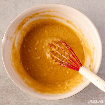 STEP 3. Make the banana bread batter. In a large bowl bowl, whisk together banana, brown sugar, oil, sour cream, eggs, melted butter, and vanilla. Add the flour mixture and gently mix with a whisk until just combined and no dry spots remain.