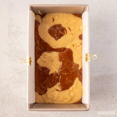 STEP 6. Swirl the top. Spoon remaining 33grams (2 tbsps) of nutella on top of the batter then, using a skewer or wooden pick, gently swirl the nutella into batter. You might need to quickly warm it in the microwave to make the Nutella slightly runny so you can easily swirl it.